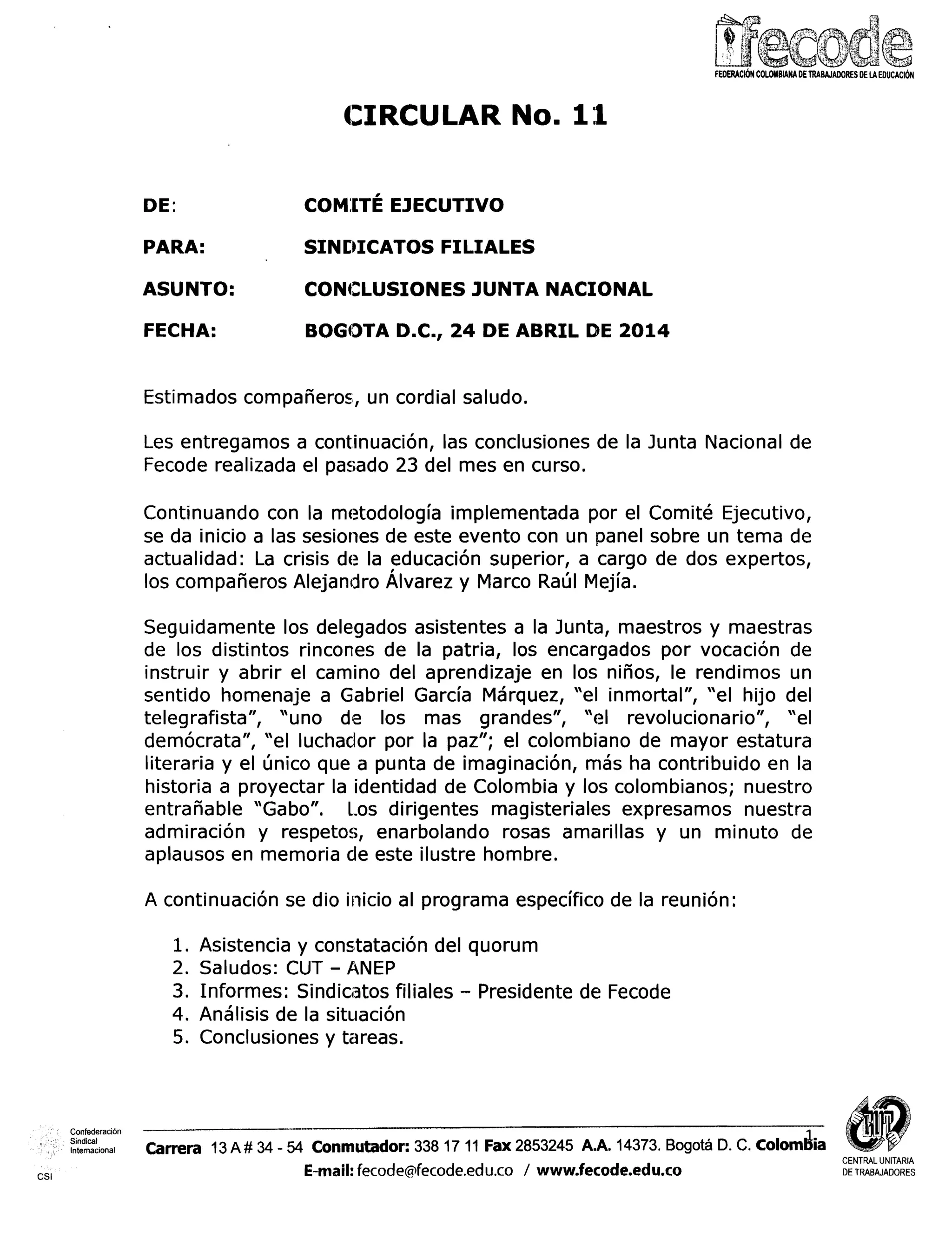 Este documento resume las conclusiones de la Junta Nacional de Fecode (Federación Colombiana de Educadores) realizada el 23 de abril de 2014. En la junta, los maestros analizaron la situación educativa y decidieron declarar un Paro Nacional del Magisterio debido a insatisfacciones con los incrementos salariales y el cumplimiento del plan de salud. Los objetivos del paro incluyen revisar los aumentos salariales para 2014 y futuros años, así como garantizar el cumplimiento del plan de salud. Las tareas acordadas fueron declarar el