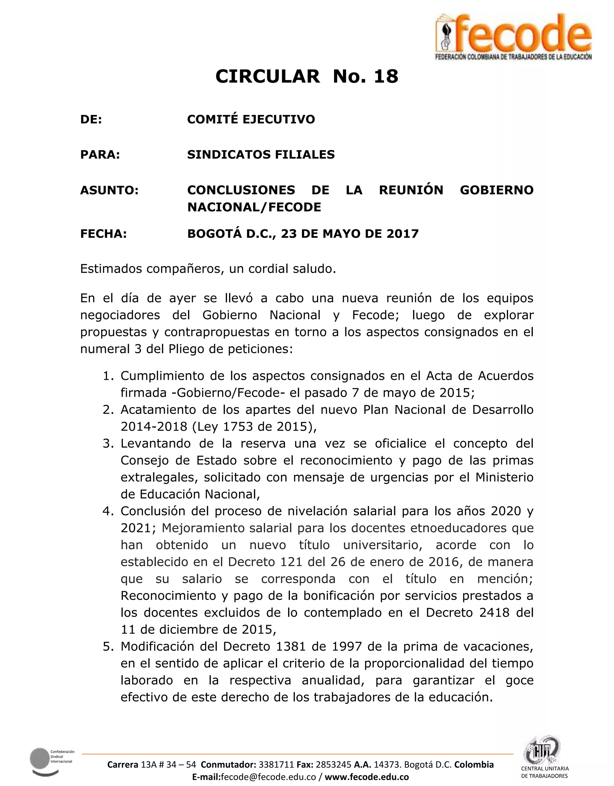 Este documento resume las conclusiones de una reunión entre el Gobierno Nacional y FECODE, el sindicato de maestros de Colombia. A pesar de explorar propuestas para abordar cinco puntos clave en el pliego de peticiones de FECODE, como el cumplimiento de acuerdos anteriores y mejoras salariales, aún no se ha llegado a un acuerdo debido a la falta de voluntad del Ministerio de Hacienda. Por lo tanto, FECODE mantendrá la huelga nacional de maestros hasta que se logre una negociación sat