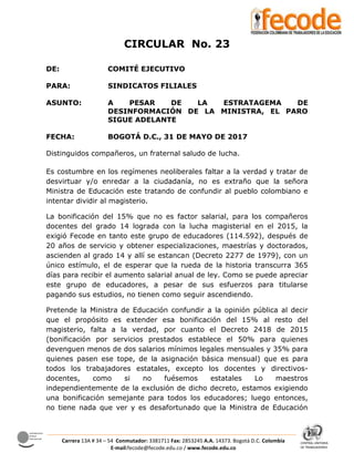 El Comité Ejecutivo de la Central Unitaria de Trabajadores convoca a los sindicatos filiales a continuar con el paro nacional del magisterio a pesar de los intentos de la Ministra de Educación de desinformar y dividir a los maestros. La ministra ha tratado de hacer parecer que la bonificación del 15% que se logró en 2015 para los maestros de grado 14 se extenderá a todos, cuando en realidad los maestros están exigiendo una bonificación similar a la otorgada a otros empleados públicos. Por lo tanto, el Comité