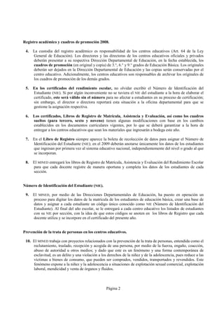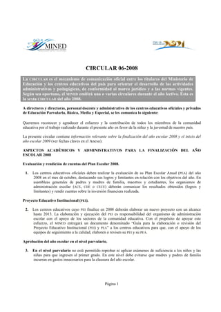 1) La circular 06-2008 del Ministerio de Educación contiene información sobre la finalización del año escolar 2008 y el inicio del año escolar 2009, incluyendo fechas claves y aspectos académicos y administrativos como la evaluación de planes escolares, elaboración de proyectos educativos, registro académico y cursos de formación docente.
