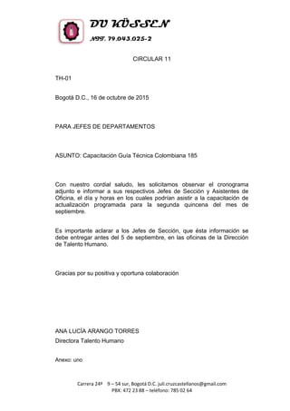 Los documentos presentan información sobre diferentes temas de recursos humanos y capacitación para empleados de la empresa DU KÜSSEN, incluyendo: 1) un cronograma de capacitación sobre la Guía Técnica Colombiana 185 para jefes de departamento, 2) actualización sobre la Norma Técnica Colombiana 185 para el personal administrativo, y 3) solicitud de actualización de datos a todo el personal como hoja de vida y copias de documentos.
