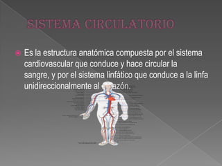 El sistema circulatorio está compuesto por el sistema cardiovascular, que conduce y hace circular la sangre a través de los vasos sanguíneos, y el sistema linfático, que conduce la linfa unidireccionalmente al corazón. La función principal del sistema circulatorio es transportar nutrientes, gases, hormonas y células sanguíneas a los tejidos a través de la sangre. Existen dos tipos de sistemas circulatorios: el cerrado, donde la sangre viaja por los vasos sanguíneos sin salir, y el abierto, donde la sangre