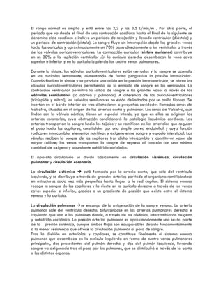 El documento describe el aparato circulatorio humano. Explica que el corazón bombea la sangre a través de las arterias y que los capilares permiten el intercambio de oxígeno y nutrientes con los tejidos antes de que la sangre regrese al corazón a través de las venas. Describe las estructuras del corazón como las aurículas, ventrículos, válvulas y músculo cardiaco, y explica cómo el impulso eléctrico genera la contracción rítmica del corazón. Finalmente, resume