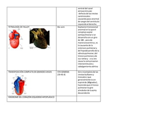 Este documento describe diversas anomalías congénitas del corazón, incluyendo defectos en el desarrollo del tabique interatrial y tabique interventricular, comunicaciones interatriales e interventriculares, tetralogía de Fallot, transposición de grandes vasos, síndrome del corazón izquierdo hipoplásico, ectopia cordis, dextrocardia, conducto arterioso persistente, atresia mitral y coartación aórtica. Se explican las causas de cada anomalía en términos del desarrollo embrioló