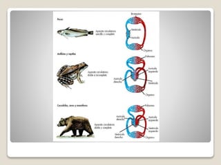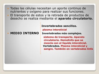 Este documento describe el aparato circulatorio en animales. Explica que existen diferentes tipos de sistemas circulatorios dependiendo del grupo animal, incluyendo sistemas abiertos y cerrados. También describe los componentes clave del sistema circulatorio como los vasos sanguíneos, el corazón, y los diferentes tipos de líquidos circulatorios como la sangre y la linfa.