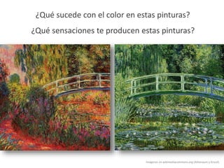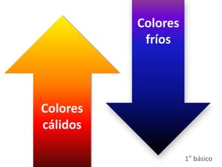 El documento describe las diferencias entre los colores cálidos y fríos. Los colores cálidos incluyen tonos rojos y amarillos y producen una sensación de calor, mientras que los colores fríos incluyen tonos morados y verdes y producen una sensación de frio. Se usan ejemplos de flores pintadas en colores cálidos y fríos para ilustrar cómo los colores afectan la sensación térmica.