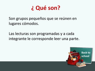 Los círculos de lectura son grupos pequeños que se reúnen periódicamente para leer y discutir libros. Tienen como objetivos promover el gusto por la lectura y compartir ideas sobre lo leído. Un coordinador guía al grupo y se asegura que se cumplan las normas como respetar las opiniones ajenas. Los círculos de lectura pueden ser útiles para niños, jóvenes y adultos.