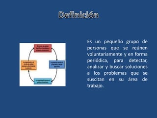 Los círculos de calidad son grupos voluntarios de trabajadores que se reúnen periódicamente para detectar y buscar soluciones a problemas en su área de trabajo. La idea es crear conciencia de calidad a través del trabajo en equipo y el intercambio de experiencias. Los círculos de calidad comparten con la administración la responsabilidad de definir y resolver problemas de coordinación, productividad y calidad. Su misión es contribuir a mejorar la empresa, respetar a los individuos y aplicar el talento de los trabajadores. El proceso