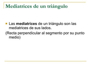 El circuncentro de un triángulo es el punto de intersección de las tres mediatrices de sus lados. Está a la misma distancia de los tres vértices y es el centro de la circunferencia circunscrita al triángulo, cuyo radio es la distancia entre el circuncentro y cualquier vértice. La posición del circuncentro depende del tipo de triángulo: está dentro para los agudos, en la hipotenusa para los rectos y fuera para los obtusos.