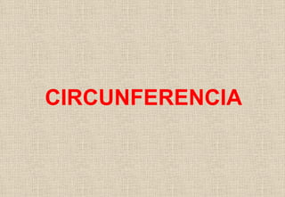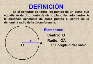 La circunferencia se define como el conjunto de puntos en un plano que están a la misma distancia de un punto central llamado centro. La distancia constante desde el centro a estos puntos se llama radio. Los elementos clave de una circunferencia son el centro y el radio.