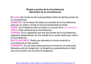 El documento describe los elementos básicos de un círculo, incluyendo el centro, diámetro, radio, arco, cuerda, recta secante y tangente. También describe los diferentes tipos de ángulos que pueden encontrarse en un círculo, como ángulos centrales, inscritos y semi-inscritos. Además, explica cómo se pueden medir los arcos y ángulos en un círculo y define la ecuación que representa un círculo.
