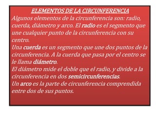 El documento describe las características básicas de las circunferencias y círculos. Explica que una circunferencia es una curva cerrada donde todos los puntos están a igual distancia del centro, y un círculo es el área dentro de una circunferencia. Detalla elementos como el radio, diámetro y arco de una circunferencia, y cómo calcular la longitud de una circunferencia y el área de un círculo.