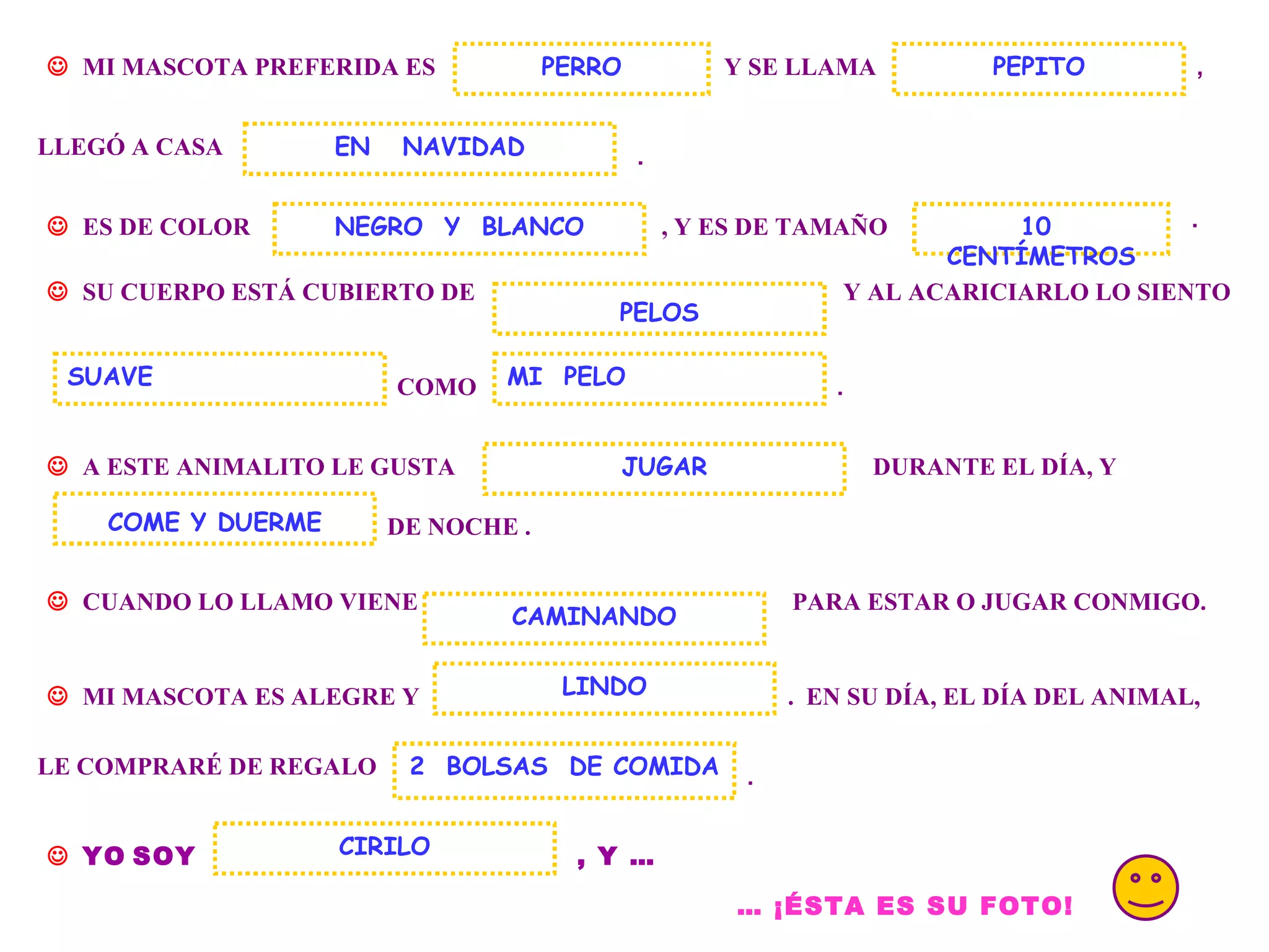 El documento habla sobre la mascota preferida del autor, un perro llamado Pepito que llegó a su casa en Navidad. Pepito es de color negro y blanco, tiene el pelaje suave y mide 10 centímetros. Es un animal alegre que le gusta jugar durante el día y dormir de noche.