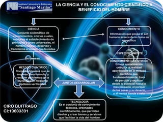 La ciencia se basa en el método científico para establecer principios y leyes que permitan explicar y transformar el mundo. El conocimiento científico se obtiene mediante una aproximación crítica a la realidad que usa el método científico para explicar tanto lo esencial como lo más común en la naturaleza. La ciencia, el método científico y el conocimiento científico juntos permiten desarrollar tecnología, que son conocimientos técnicos ordenados para crear bienes y servicios que mejoran la vida