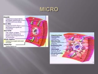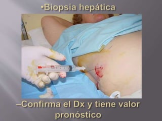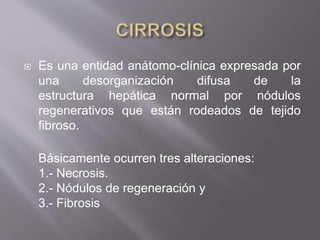 La cirrosis hepática se caracteriza por la desorganización de la estructura del hígado debido a la formación de nódulos de tejido cicatricial. Esto ocurre como resultado de daño hepático crónico que conduce a inflamación, necrosis y regeneración anormal del tejido. Las principales causas de cirrosis incluyen el consumo excesivo de alcohol, hepatitis virales y trastornos hereditarios. La cirrosis causa insuficiencia hepática y puede provocar complicaciones graves como hemorragia digestiva, ascitis y encefalopatía