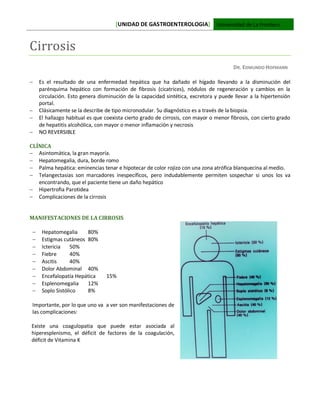Este documento resume las características de la cirrosis hepática, incluyendo sus causas principales como la hepatitis alcohólica y viral, manifestaciones clínicas como la hepatomegalia y ascitis, complicaciones como la hipertensión portal y la encefalopatía hepática, y su clasificación y tratamiento según la escala de Child-Pugh. La cirrosis es el resultado de una enfermedad hepática crónica que daña el parénquima y conduce a la formación de fibrosis y nódulos de regeneración.