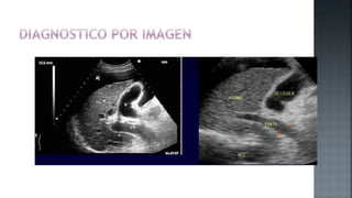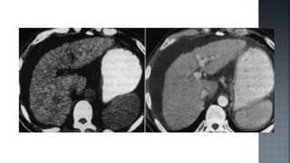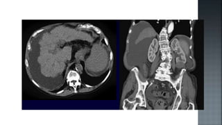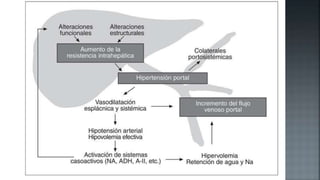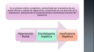 Este documento describe la cirrosis hepática, incluyendo su etiología, clasificación, manifestaciones clínicas, exámenes complementarios y alteraciones hematológicas. La cirrosis es un proceso crónico caracterizado por una amplia fibrosis e insuficiencia hepática. Las principales causas son el alcoholismo, la hepatitis y enfermedades autoinmunes o genéticas. Puede manifestarse de forma compensada o descompensada, con hipertensión portal, encefalopatía o insuficiencia hepática. La biopsia hepática es necesaria para establecer