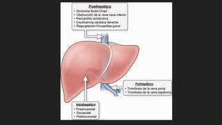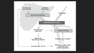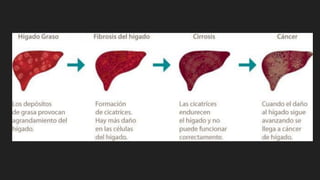 La cirrosis causa fibrosis y formación de nódulos regenerativos en el hígado, lo que reduce su masa y función. Esto conduce a complicaciones como hipertensión portal, ascitis y hemorragia por varices esofágicas. La cirrosis se puede causar por alcoholismo, hepatitis virales, esteatosis no alcohólica u otras enfermedades hepáticas. El diagnóstico incluye síntomas como ictericia y trastornos de la coagulación, así como biopsia hepática. El tratamiento se enfoca en la abstinencia del alcohol