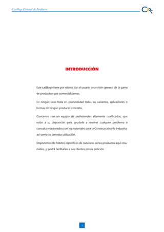 Este documento proporciona un resumen de los principales productos de aislamiento térmico y acústico que la empresa comercializa. Incluye paneles y mantas de lana de vidrio, mineral y roca para aislamiento de fachadas, cubiertas, suelos y medianerías. También presenta productos de aislamiento flexible para tuberías e instalaciones y de poliestireno expandido para cubiertas e interiores. El catálogo tiene el objetivo de dar una visión general de la amplia gama de productos de aislamiento disponibles.