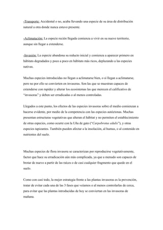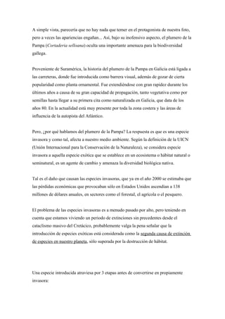 El plumero de la Pampa, originario de Suramérica, se ha convertido en una especie invasora en Galicia debido a su rápida propagación. Las especies invasoras como esta amenazan la biodiversidad local al competir con las especies nativas por los recursos y el hábitat. Además, muchas especies invasoras como el plumero de la Pampa se reproducen vegetativamente, haciendo su erradicación aún más difícil. La mejor estrategia para hacer frente a las especies invasoras es la prevención para evitar que las plantas introdu