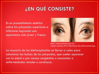 La blefaroplastia es un procedimiento estético que rejuvenece la apariencia de los párpados superiores e inferiores al eliminar bolsas y exceso de piel, siendo una cirugía segura y duradera. Se lleva a cabo principalmente para corregir problemas visuales causados por párpados caídos y está asociada a riesgos que requieren atención postoperatoria cuidadosa. La recuperación implica restricciones como evitar maquillaje y lentes de contacto durante varias semanas.