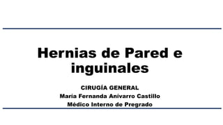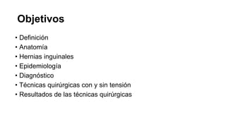 Este documento describe la anatomía, tipos, diagnóstico y tratamiento quirúrgico de las hernias de pared e inguinales. Explica la anatomía del conducto inguinal y sus estructuras contenidas. Describe los diferentes tipos de hernias inguinales e incisionales y sus clasificaciones. El diagnóstico se realiza clínicamente y con ultrasonido o TAC. El tratamiento quirúrgico incluye técnicas abiertas como Shouldice, Lichtenstein y laparoscópicas como TAPP o TEP, buscando