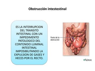 1. La obstrucción intestinal es la interrupción del tránsito intestinal con un impedimento patológico del contenido luminal intestinal, imposibilitando la expulsión de gases y heces por el recto.