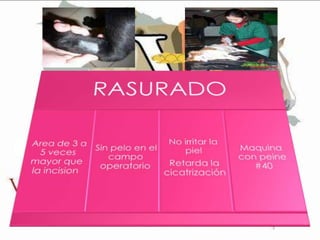 Este documento trata sobre los principios básicos de la cirugía y la terapéutica quirúrgica en perros y gatos. Describe la sala de preparación quirúrgica, el quirófano, el mobiliario requerido como la mesa de cirugía y los diferentes tipos de instrumental quirúrgico. También explica los conceptos de asepsia, esterilización, desinfección y antisepsia que son fundamentales para prevenir infecciones en el acto quirúrgico.