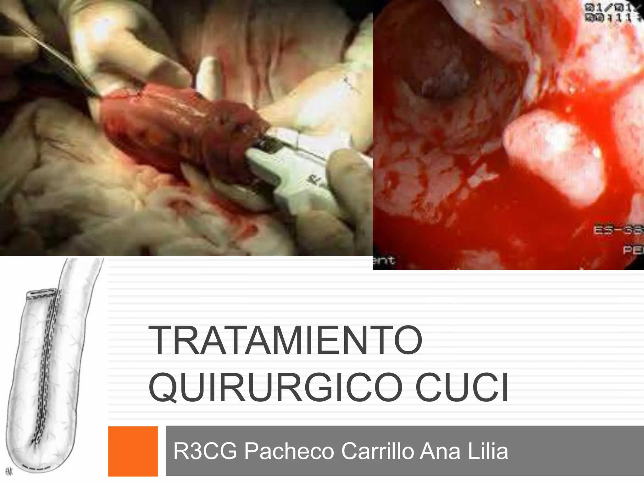 Este documento describe los procedimientos quirúrgicos para tratar la colitis ulcerosa, incluyendo la colectomía, la proctocolectomía con ileostomía y la proctocolectomía laparoscópica con reservorio ileoanal (IPAA). Explica los detalles técnicos de cada procedimiento, como la preparación del paciente, la disección del recto, y los métodos de construir un reservorio ileoanal mediante anastomosis ileoanal manual o mecánica. El objetivo final de estos procedimientos es mejorar la calidad de vida