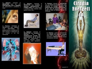 El documento proporciona un protocolo de 24 pasos para realizar una sesión de cirugía energética Reiki. El protocolo incluye solicitar una descripción del problema del receptor, ubicar los síntomas, visualizar la forma física del problema, extraer la energía negativa usando los dedos astrales, enviar la energía a la luz, sellar y sanar la zona, y terminar llenando al receptor de energía positiva.
