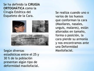 La cirugía ortognática es una cirugía estética del esqueleto facial que corrige deformidades maxilofaciales cuando los huesos de la cara están alterados en tamaño, forma u posición. Estas deformidades afectan la oclusión dental en el 25-30% de la población. La cirugía ortognática involucra la corrección quirúrgica de los huesos luego de alinear los dientes con ortodoncia. Con tecnología tridimensional, los cirujanos pueden predecir con precisión los resultados