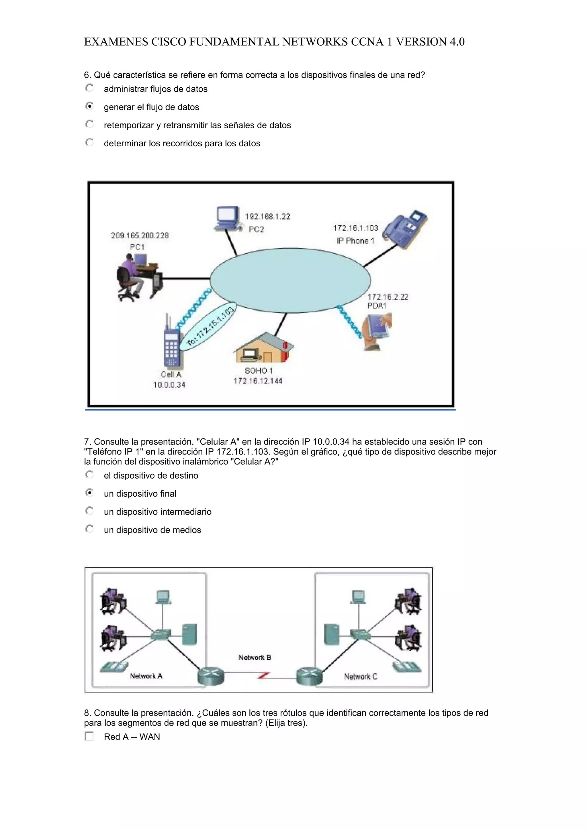 Este examen cubre conceptos fundamentales de redes como las funciones de los dispositivos intermediarios, la encapsulación, las capas del modelo OSI y TCP/IP, y los protocolos de capa de aplicación como DNS, HTTP, FTP y correo electrónico. Incluye preguntas sobre conceptos de red como direccionamiento, puertos, modelos de red cliente-servidor y entre pares, y las capas del modelo OSI.
