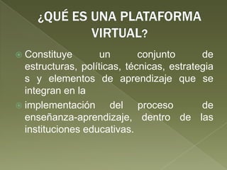 Este documento describe un proyecto para crear una plataforma virtual para la Facultad de Ciencias Económicas. Explica qué es una plataforma virtual, su importancia, y las plataformas más utilizadas como Moodle, Dokeos y Claroline. Se concluye que Claroline sería la mejor opción para la facultad debido a sus ventajas para mejorar la comprensión de los estudiantes. El plan incluye objetivos, ejecución enfocada en los estudiantes, y evaluación con un equipo de trabajo.