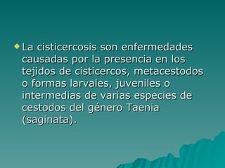 La cisticercosis es una enfermedad causada por la presencia de cisticercos o formas larvales del cestodo Taenia saginata en los tejidos, que se adquiere al ingerir huevos o proglótides del parásito en alimentos contaminados o por auto-infección. Sus manifestaciones clínicas más comunes son epilepsia, cefalea e hipertensión intracraneal cuando se localiza en el SNC. El tratamiento depende de los órganos afectados y puede requerir cirugía o medicamentos como praziqu