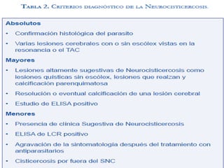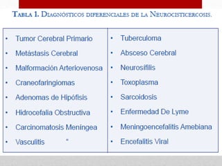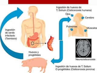 Este documento trata sobre la neurocisticercosis, una enfermedad parasitaria causada por la infección del estado larvario de la Taenia solium en el sistema nervioso central. Describe el ciclo de vida del parásito, los síntomas como convulsiones y déficit neurológicos, y el diagnóstico a través de exámenes de sangre, líquido cefalorraquídeo y resonancia magnética. También cubre el tratamiento médico con medicamentos antiparasitarios y quirúrgico para casos donde el tratamiento mé