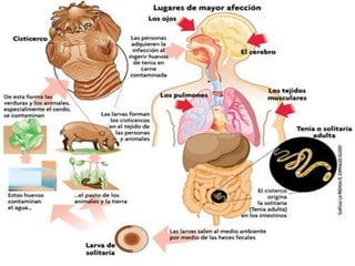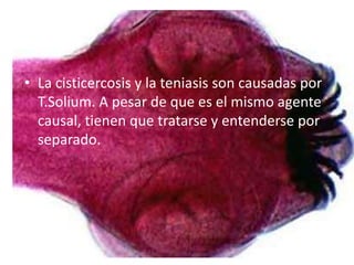 La cisticercosis y la teniasis son causadas por el mismo parásito, Taenia solium, pero deben tratarse por separado. La cisticercosis ocurre cuando los huevos del parásito se desarrollan en tejidos como el cerebro, los ojos y los músculos, mientras que la teniasis ocurre cuando el parásito adulto vive en el intestino delgado.
