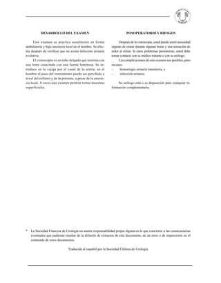 Este documento describe una cistoscopia, un procedimiento para examinar la uretra y la vejiga a través de los órganos naturales usando un endoscopio. Una cistoscopia se realiza para diagnosticar problemas urinarios o como parte de un programa de vigilancia. El procedimiento se lleva a cabo bajo anestesia local y el cistoscopio se introduce en la vejiga a través de la uretra. El examen puede revelar muestras superficiales y rara vez causa complicaciones como hemorragia o infección urinaria.