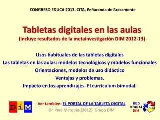 El documento analiza el uso de tabletas digitales en aulas, destacando sus ventajas como acceso a información y multifuncionalidad, así como los riesgos asociados como la dependencia de aplicaciones y sobrecarga de trabajo docente. Se presenta un modelo bimodal para su integración en la enseñanza, que combina metodologías tradicionales y digitales para mejorar el aprendizaje autónomo y el desarrollo de competencias. También se mencionan las problemáticas y beneficios observados a través de investigaciones sobre el impacto de las tabletas en la educación.