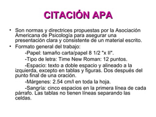 Este documento presenta las normas y directrices de la Asociación Americana de Psicología (APA) y Vancouver para la presentación de trabajos escritos y la citación de referencias bibliográficas. Explica el formato general de APA para el papel, tipo de letra, espaciado y márgenes y proporciona ejemplos de cómo citar libros, periódicos, páginas web, artículos de revista e informes siguiendo los estilos APA y Vancouver.