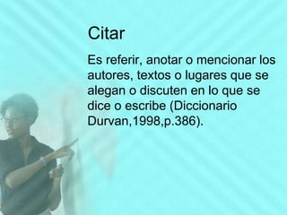 Este documento proporciona instrucciones detalladas sobre cómo citar fuentes siguiendo el estilo de la American Psychological Association (APA). Explica los tipos de citas (directas, indirectas y secundarias), cómo citar diferentes tipos de fuentes (libros, artículos, imágenes, etc.), y cómo incluir referencias bibliográficas. También cubre temas como citas de recursos en línea, citas de varios autores, y qué hacer cuando falta información para construir una cita completa.