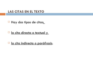 Este documento proporciona normas APA para citas bibliográficas en el texto, incluyendo cómo citar una fuente, citas directas e indirectas, citas cortas y largas, múltiples autores, trabajos sin fecha o autor, y partes específicas de una fuente. Explica que las citas en el texto deben incluir el apellido del autor y fecha, y que las citas directas de más de 40 palabras se separan del texto sin comillas. También cubre cómo citar trabajos con uno, dos, o varios autores.