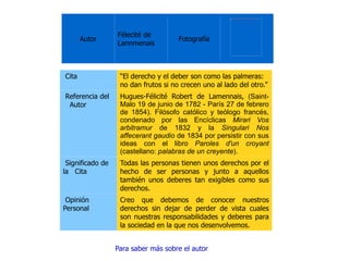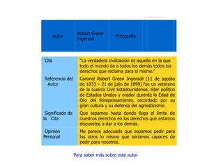 El resumen presenta citas de 5 autores sobre temas relacionados con los derechos humanos, la democracia y la educación. Robert Green Ingersoll habla de dar a los demás los mismos derechos que reclamamos. Lamennais dice que los derechos conllevan deberes. Platón señala que la civilización se basa en la persuasión no la fuerza. Einstein aboga por un ideal democrático donde todos seamos iguales. Y Pasteur sugiere enseñar a los hijos a superar las dificultades en lugar de ev