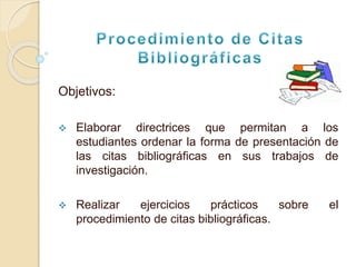 Este documento presenta directrices sobre técnicas de estudio y redacción, incluyendo cómo elaborar citas bibliográficas. Explica qué es una referencia bibliográfica, los estilos de citación más utilizados y cómo realizar citas textuales y parafraseadas, además de abreviaturas comunes. Finalmente, muestra ejemplos de cómo citar diferentes tipos de fuentes como libros, artículos y tesis.