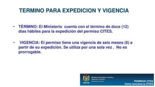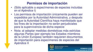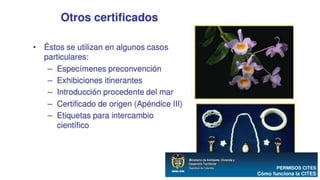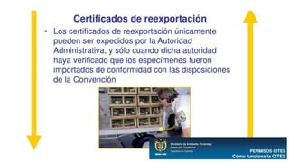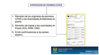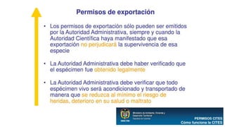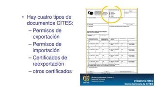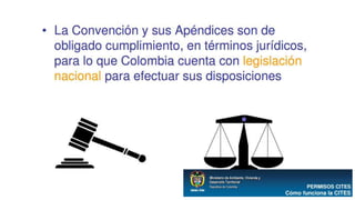 La CITES es una convención internacional firmada en 1973 que busca regular el comercio internacional de especies silvestres amenazadas para prevenir su explotación insostenible. Establece un marco jurídico y mecanismos para controlar el comercio de especies incluidas en tres apéndices según su grado de amenaza. Las partes signatarias se reúnen periódicamente para adoptar resoluciones que orientan la interpretación y aplicación de la convención.