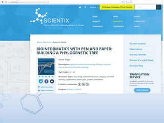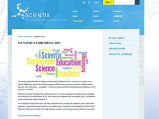 Este documento proporciona información sobre el proyecto Scientix y sus actividades. Brevemente describe el objetivo de Scientix de promover las materias STEM, los recursos disponibles en su portal web, los proyectos europeos relacionados con STEM, las conferencias y talleres organizados, y las oportunidades de colaboración entre proyectos. También menciona los puntos de contacto nacionales de Scientix y el panel de profesores.