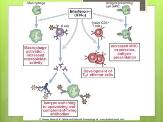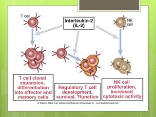 Este documento define las citocinas como productos secretados por células del sistema inmune que median una variedad de efectos en otras células. Describe sus propiedades generales y las divide en citocinas de la inmunidad innata como el TNF, IL-1 e IL-12, y de la inmunidad adaptativa como la IL-2, IL-4 e IFN-γ. Explica sus funciones como la activación de mecanismos de defensa, direccionamiento de la respuesta inmune y estimulación de linfocitos y macrófagos.