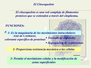 El citoesqueleto es una red de filamentos proteicos que realizan funciones clave como movimiento celular, resistencia mecánica y organización interna. Se compone de tres tipos de filamentos: filamentos intermedios, microtúbulos y filamentos de actina, cada uno con características y funciones específicas. Las proteínas asociadas regulan la dinámica y estabilidad de estos filamentos, permitiendo su interacción y contribuyendo a diversas actividades celulares.