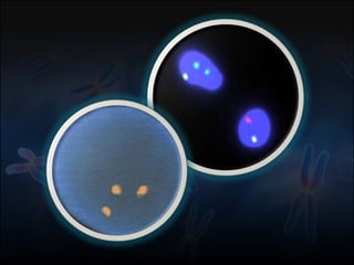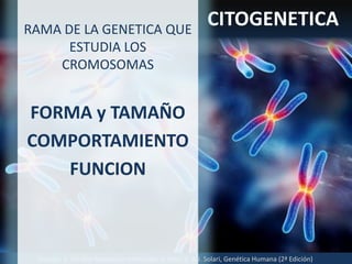 El documento presenta una revisión sobre la genética humana, enfocándose en la clasificación y diagnóstico de cromosopatías, así como en la estructura y número de cromosomas humanos. Incluye métodos diagnósticos y las indicaciones para estudios genéticos en diferentes etapas de la vida. También se discuten las anomalías cromosómicas más comunes y sus implicaciones clínicas.
