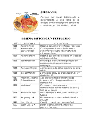 Este documento presenta información sobre citología, biología y taxonomía de diferentes organismos, así como sobre los elementos biogénicos que componen la materia viva. Se define citología y se resume brevemente la historia de este campo. También se proporcionan tablas taxonómicas de varios animales, plantas y microorganismos, así como una explicación de los elementos primarios, secundarios y oligoelementos que componen los seres vivos.