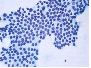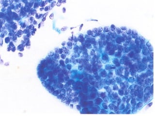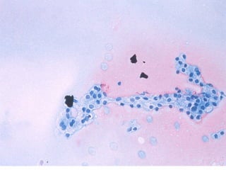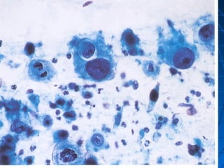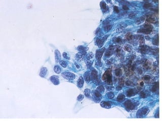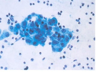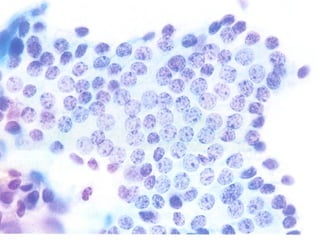 El documento detalla diferentes tipos de hallazgos citológicos relacionados con la tiroides, incluyendo características de nódulos tiroideos benignos y malignos. Se describen patrones celulares y características morfológicas que pueden indicar tiroiditis, adenomas y varios tipos de carcinoma, como el papilar y medular. Un enfoque se centra en la combinación de características celulares y del fondo para ayudar en el diagnóstico diferencial.